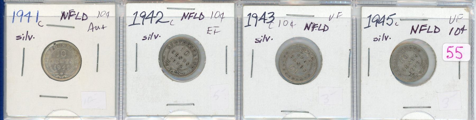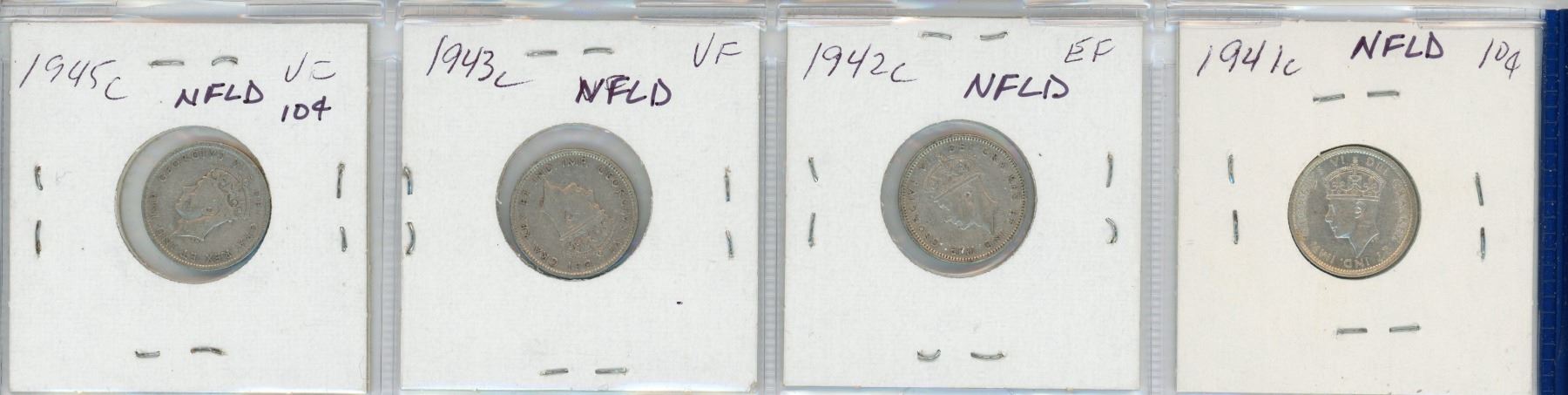 Lot of 4, Newfoundland silver 10 cent coins - 1941c-1943c,1945c