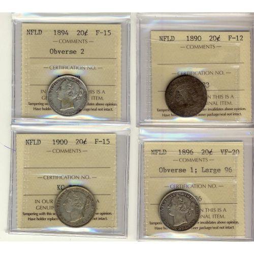 Lot of 4 Nfld 20¢ all ICCS graded. Includes 1890 F12, 1894 Obv 2 F15, 1896 Obv 1 Lg96 VF20 and 1900 F15.