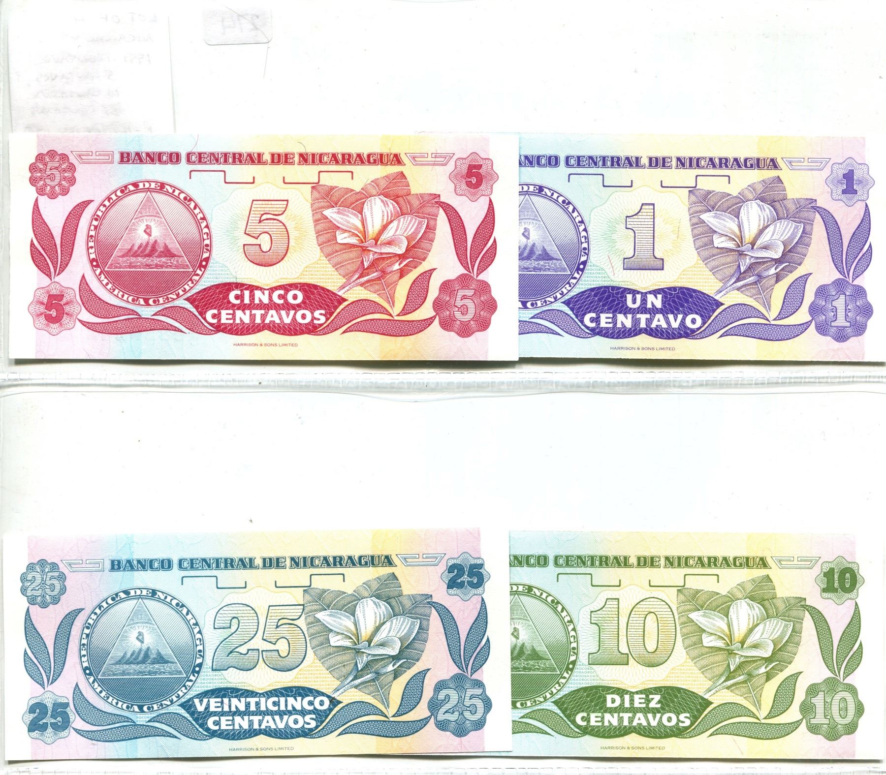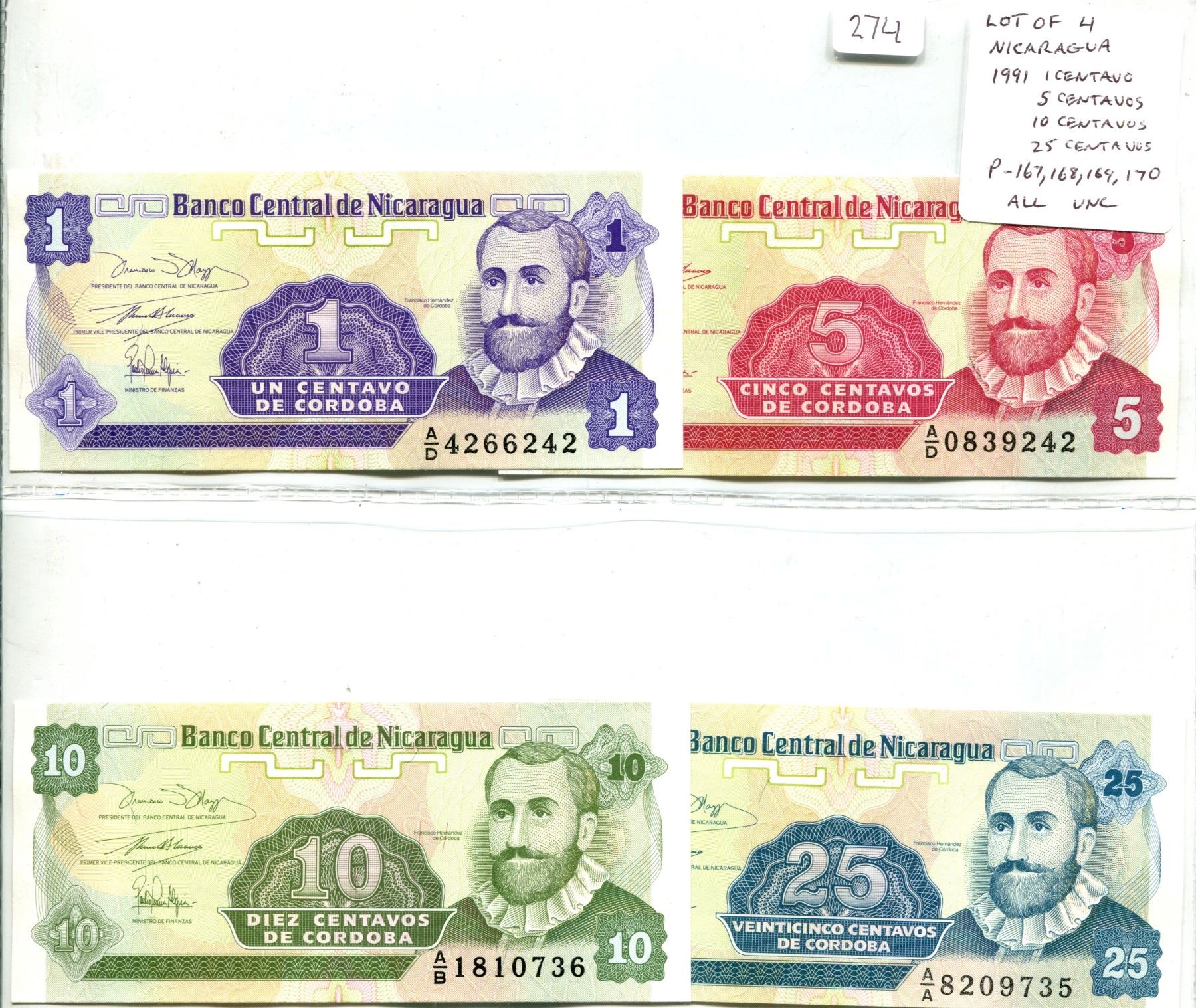 Lot of 4 Nicaragua 1991 Banco Central de Nicaragua notes. Includes 1 centavo, 5 centavos, 10 centavos & 25 centavos. All depict explorer Francisco Hernandez de Cordoba. P-167, 168, 169, 170. All Unc.