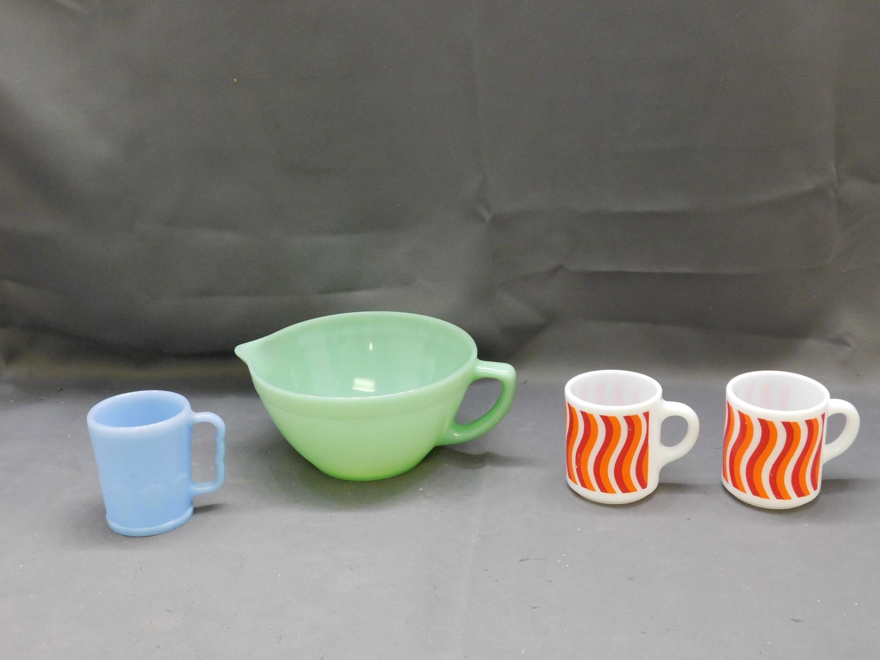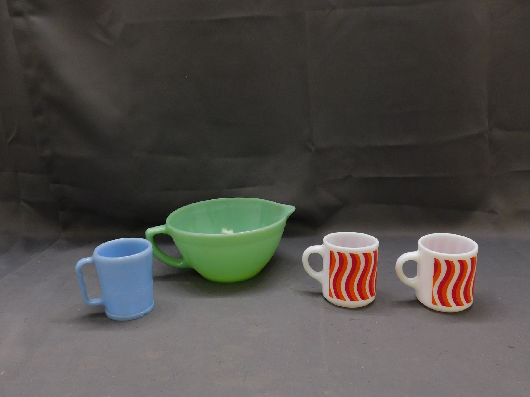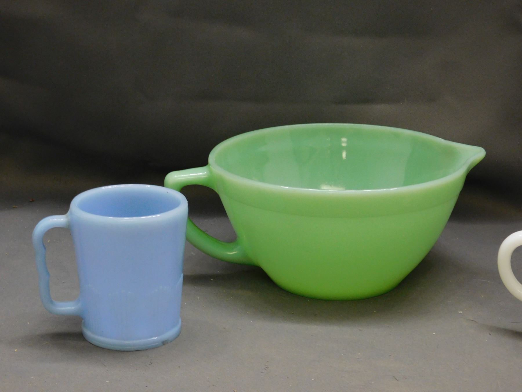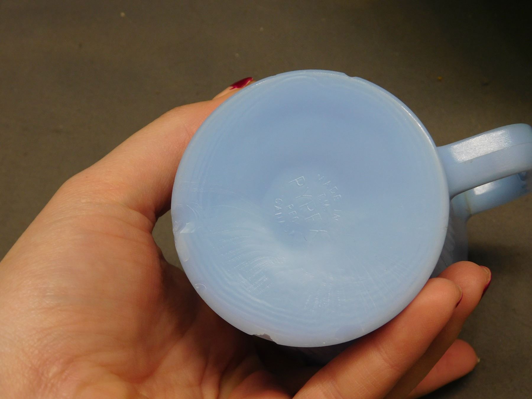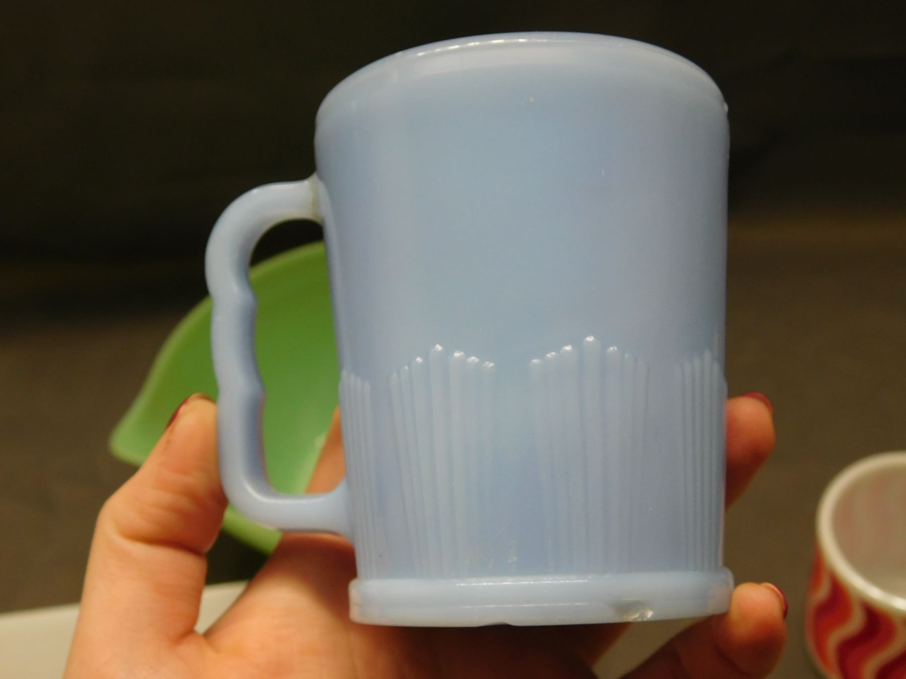 blue mug has chips along bottom. batter bowl has 1 chip along rim