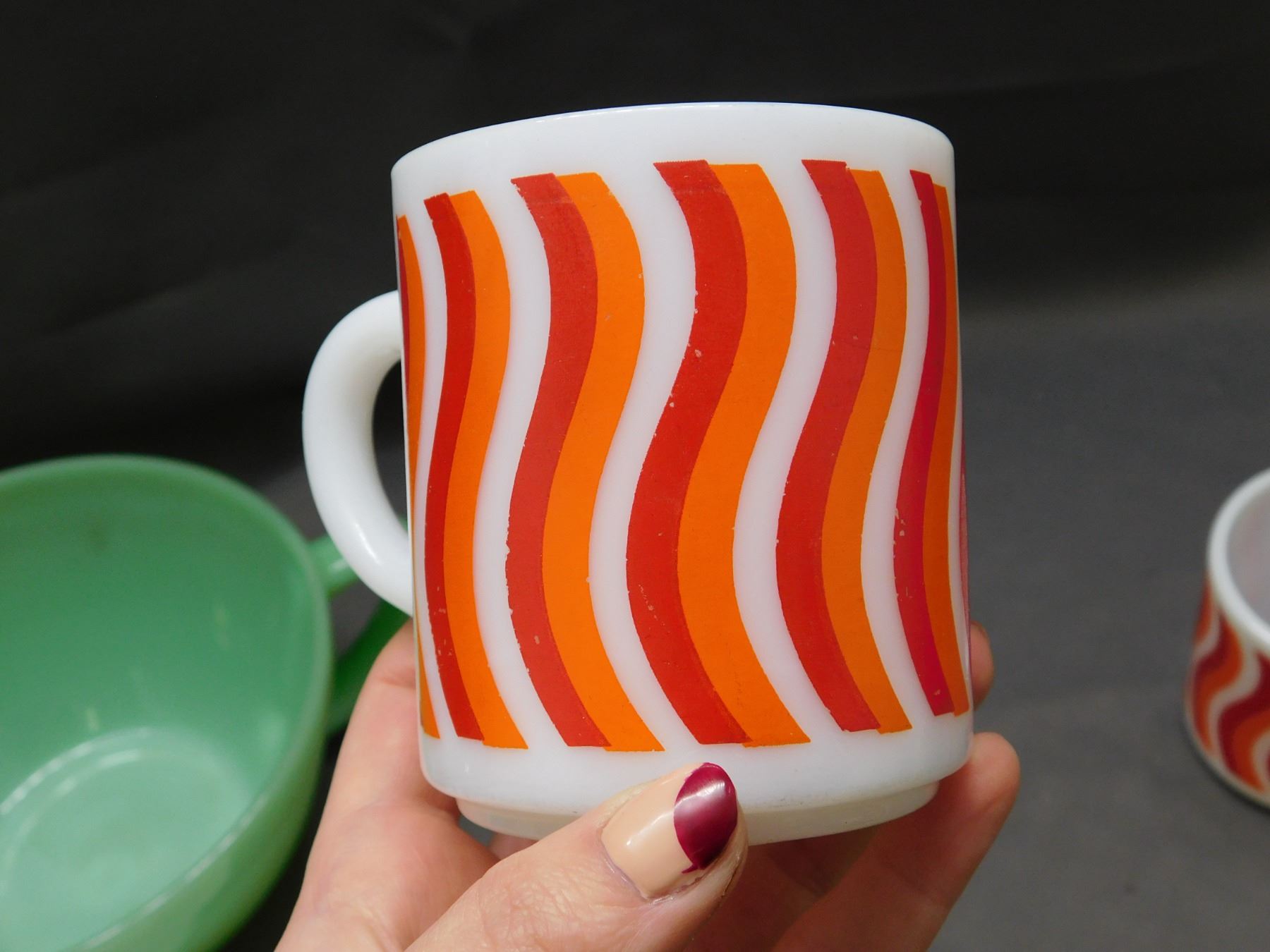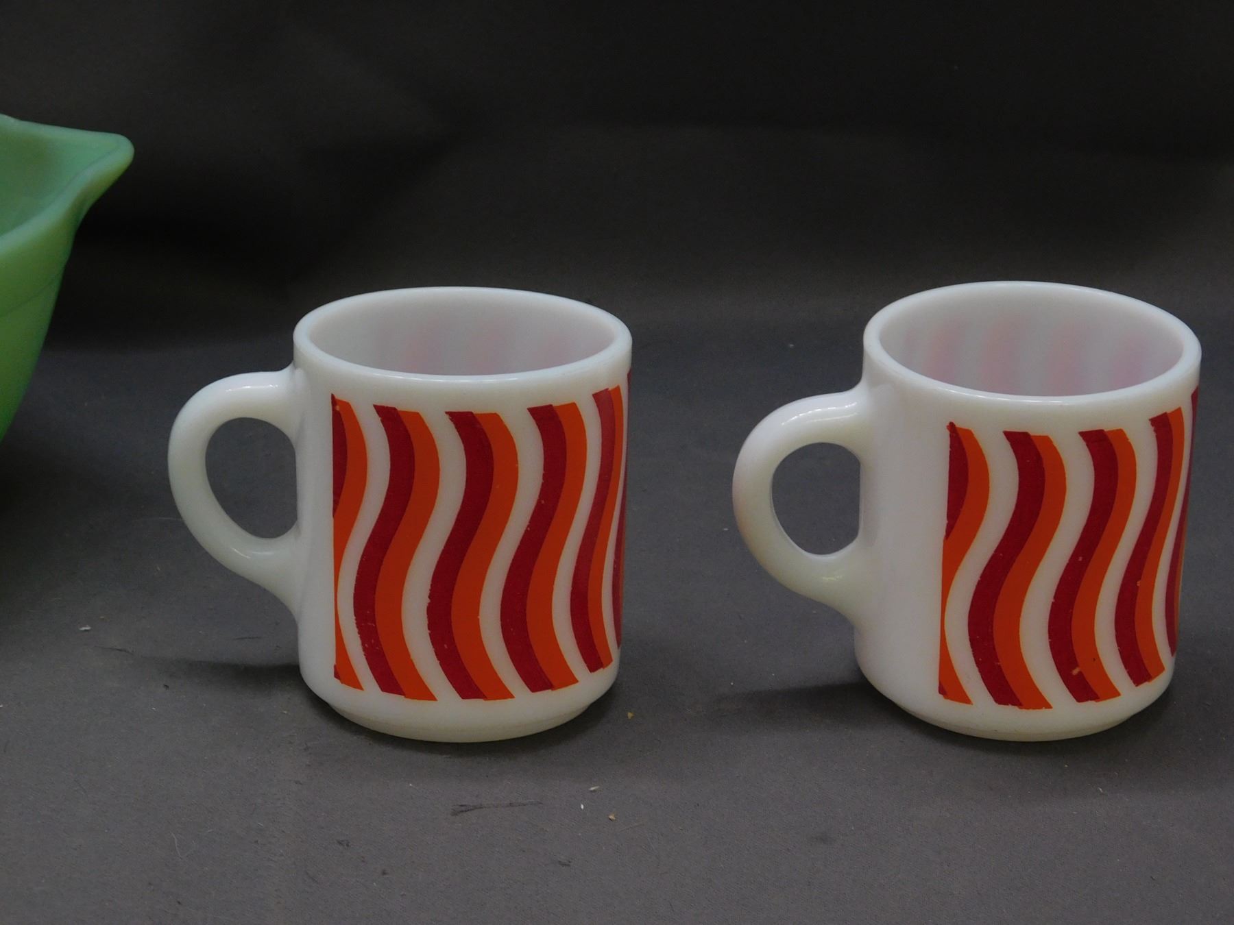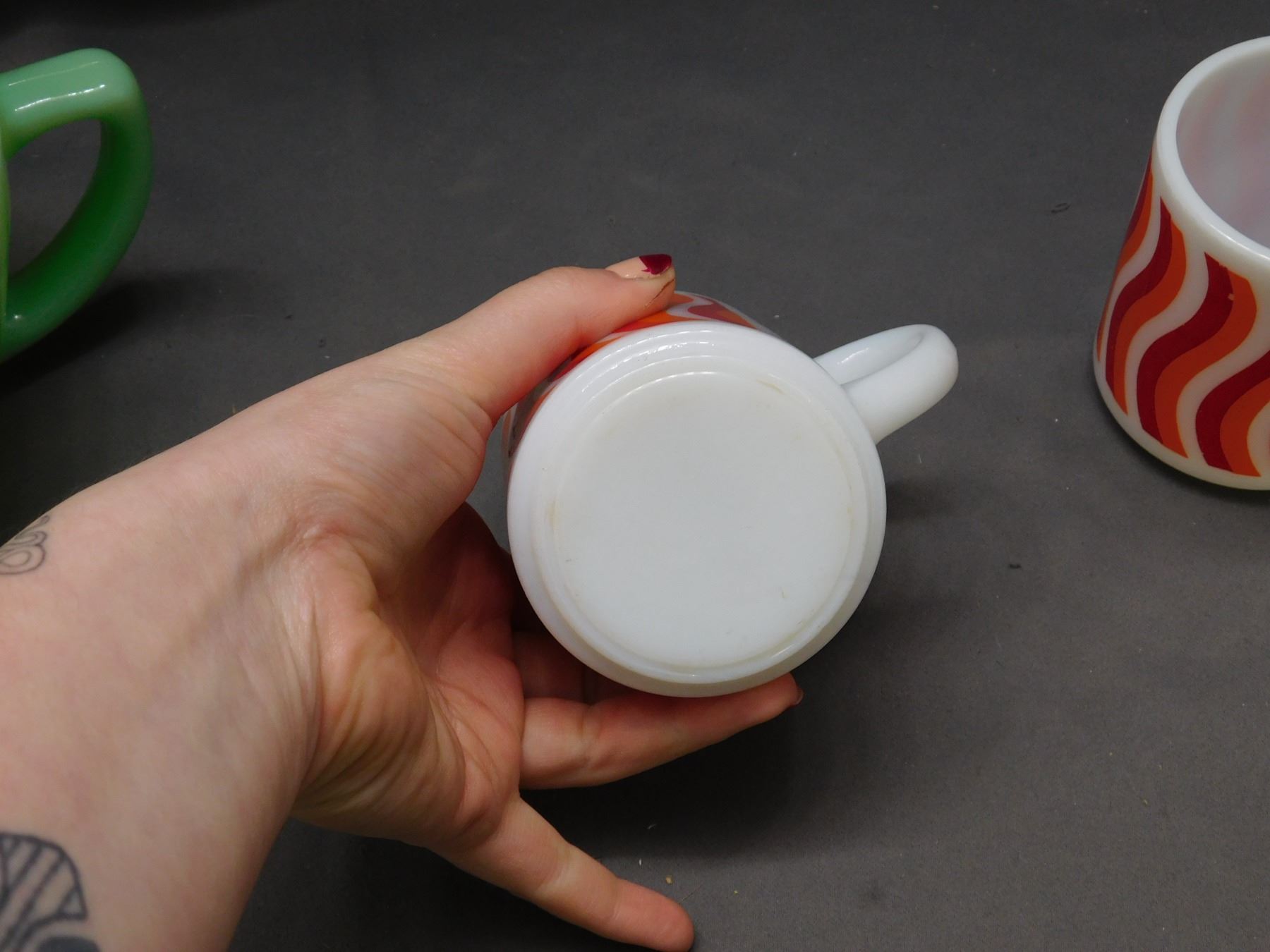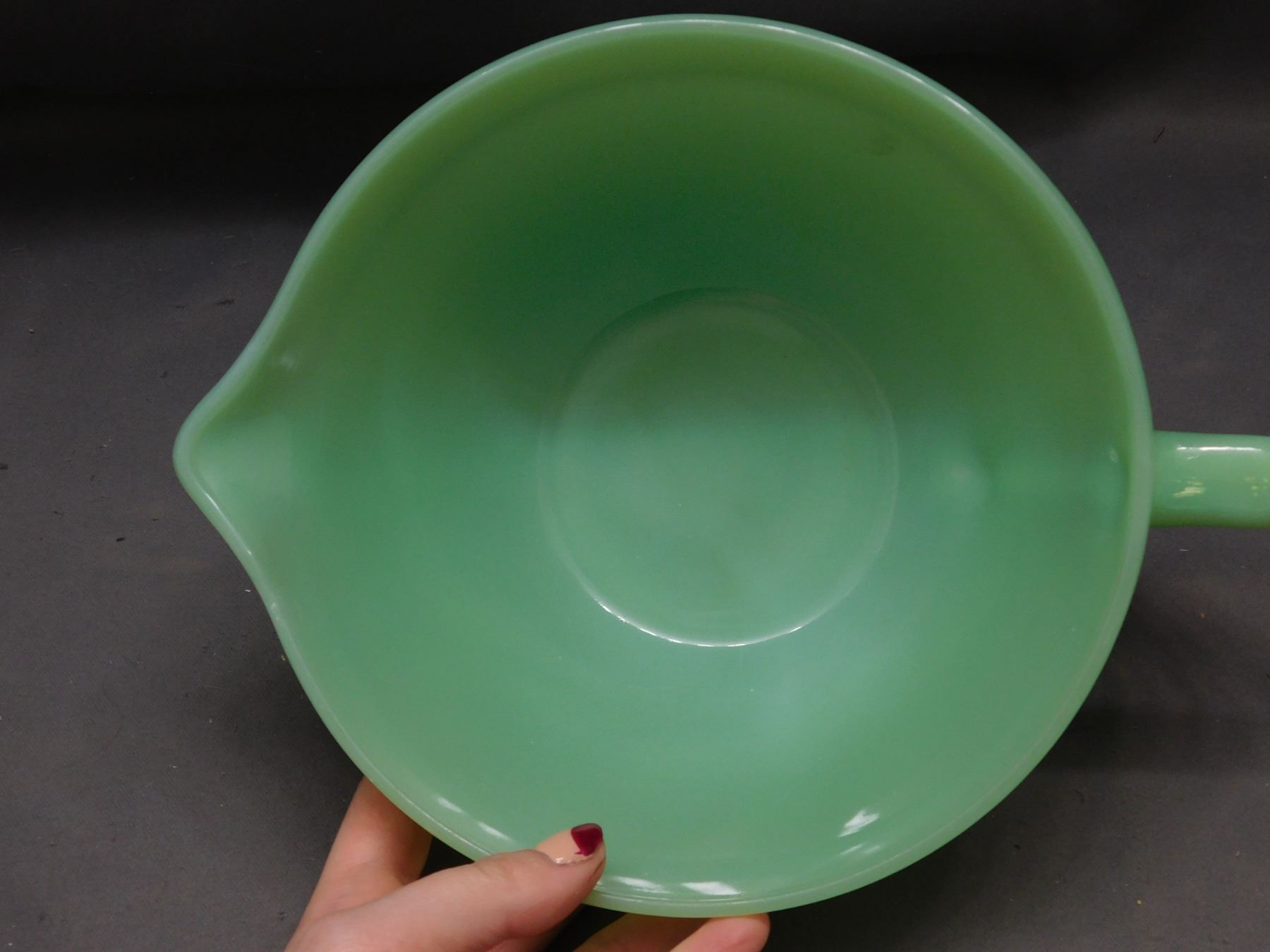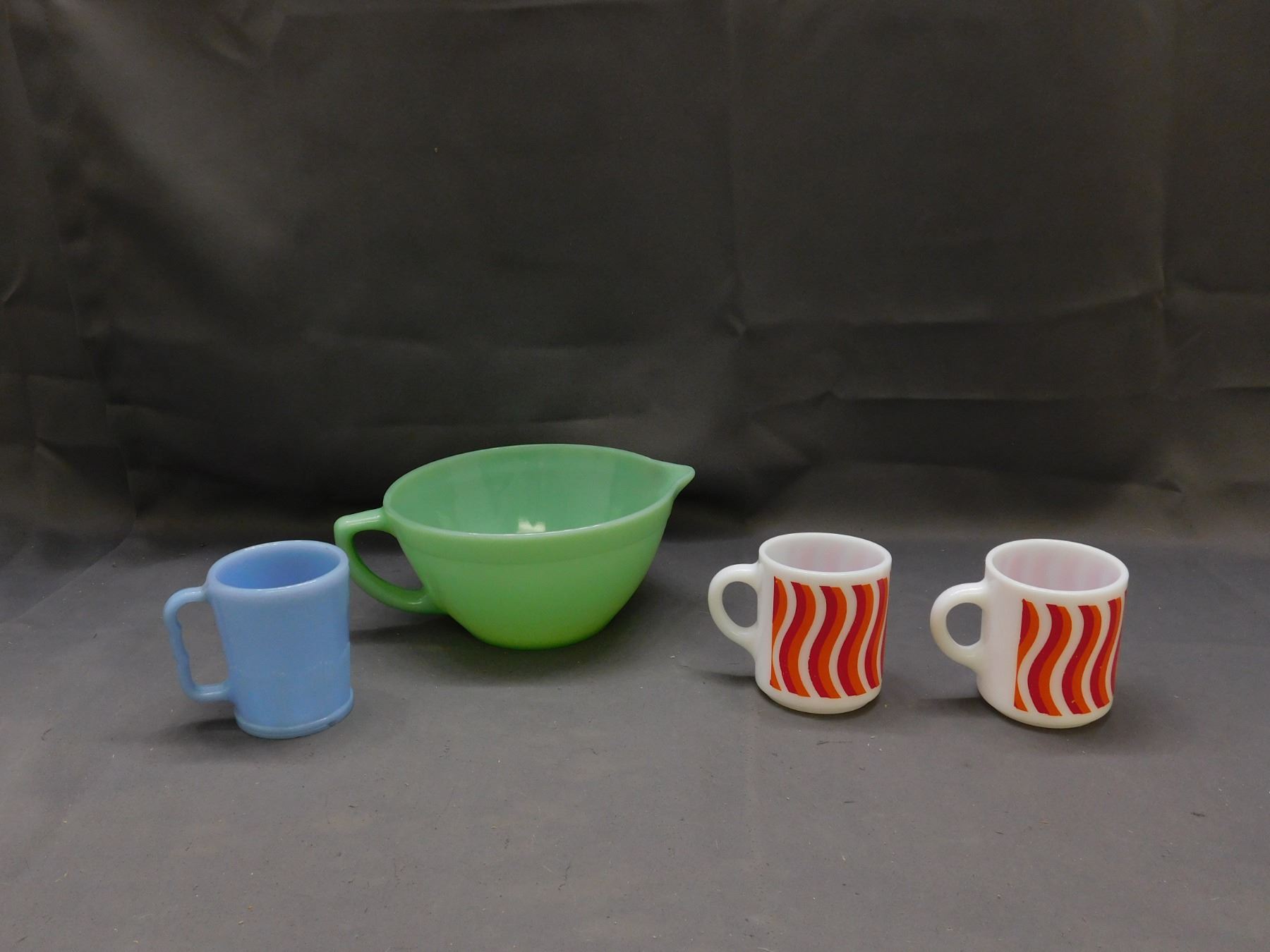 blue mug has chips along bottom. batter bowl has 1 chip along rim