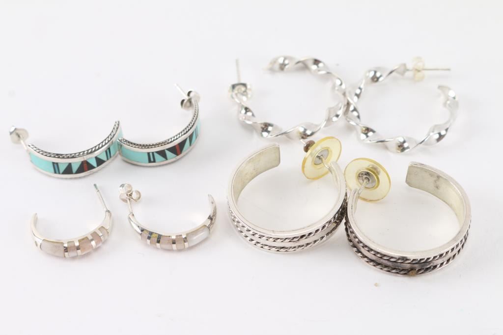 (1) Zuni half moon shaped earrings, sterling silver inlaid with turquoise, onyx and coral. Signed.