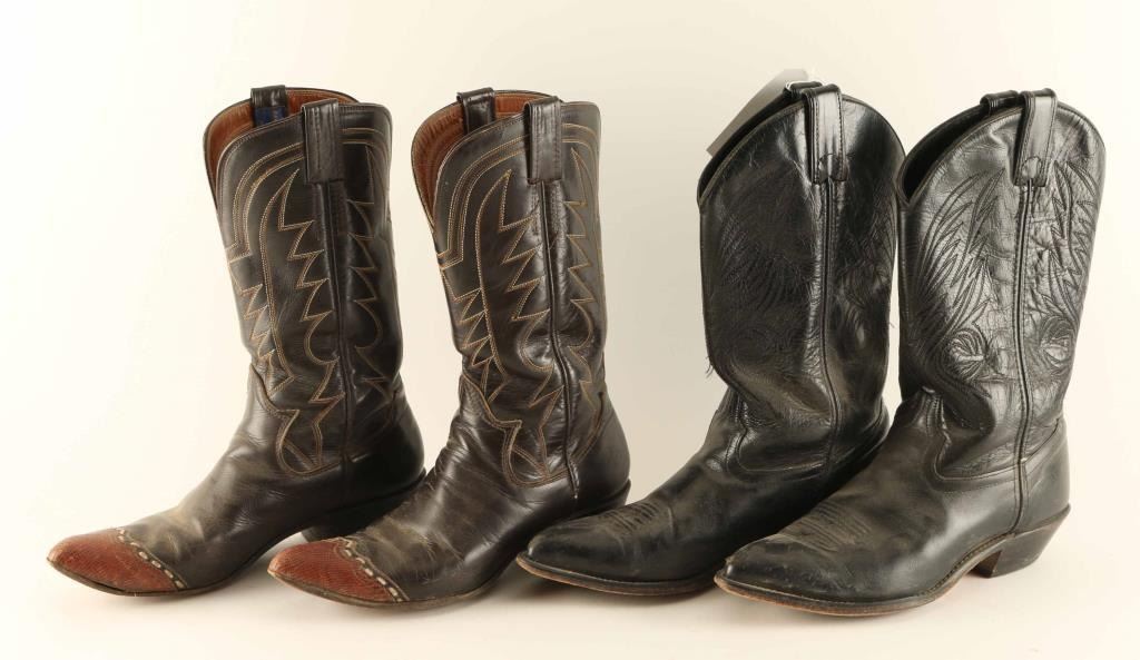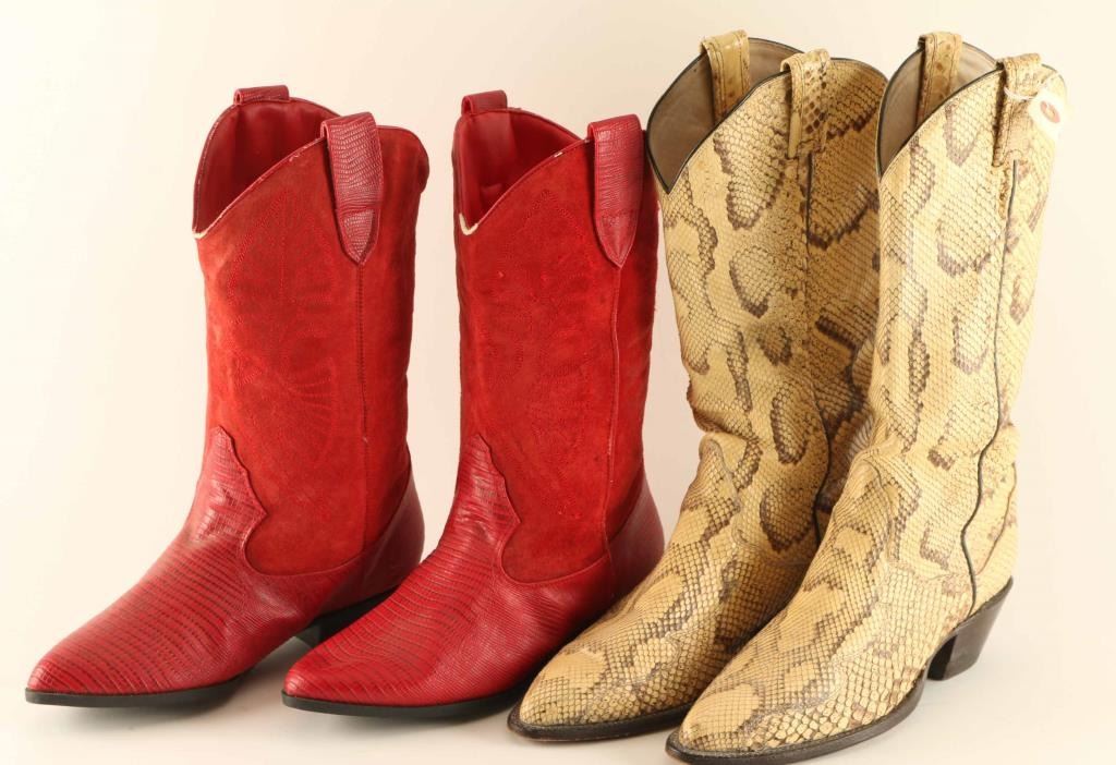 (1) Pair Black leather boots by code west (1) Red Newport boots faux snake (1) Two-tone brown leather and snake boots size 365 (1)Tony Lama snake skin boots size 8 From Arizona collector Don Fortney Sr.