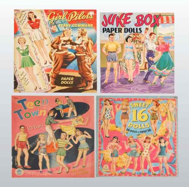 Description Circa 1940s. "Girl Pilots of The Ferry Command", "Sweet 16 Dolls", and "Teen Town" are Merrill books. All these sets are damaged. "Juke Box Paper Dolls", a Saalfield book, has two punched out dolls. There are many problems with these sets.