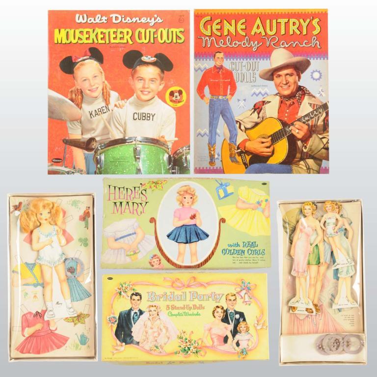 Description Circa 1950s. Gene Autry's Melody Ranch", Walt Disney's "Mouseketers", "Bridal Party", and "Here's Mary with Real Golden Curls". All the sets are uncut and in very good condition with average wear and age.
