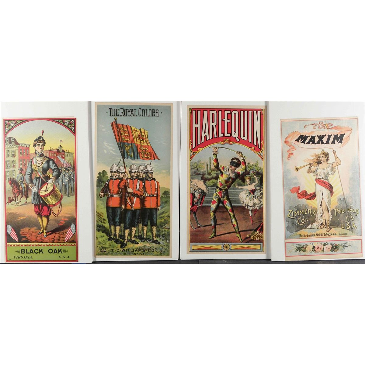Lot of 4 Paper Tobacco Labels. Including Maxim, Harlequin, The Royal Colors and Black Oak. All in near mint condition. Maxim measures 7 X 12 1/4 inches.
