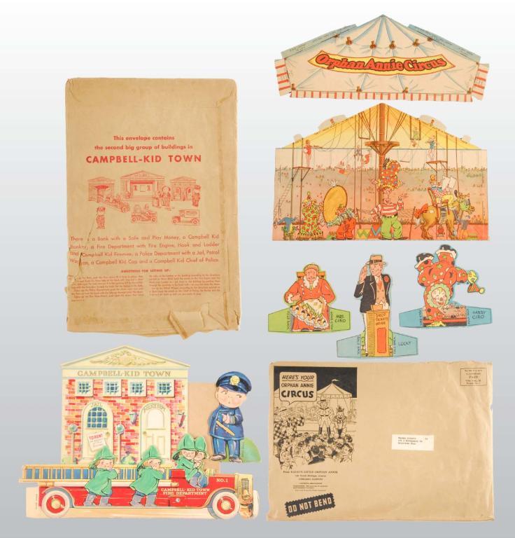 Description Circa 1930s-1941s. The "Campbell Kid Town" has lots of cut pieces in very good condition with the original mailing envelopes. Each envelope contains separate sections of the town. The pieces are in good condition; the envelopes are torn. "Orphan Annie's Circus" has the original mailing envelope and many, many pieces of the circus including the big top, side show and Annie herself. The cut pieces are in good condition; the envelope is fair. The "Pillsbury Bakery" has many punch out pieces and the original mailing envelope is in poor condition. "Post Toasties" has cereal box cut outs of Mickey Mouse and Pinocchio. A small group of stand -up wild west characters and five Quaker Puffed Wheat cereal box houses are also included.