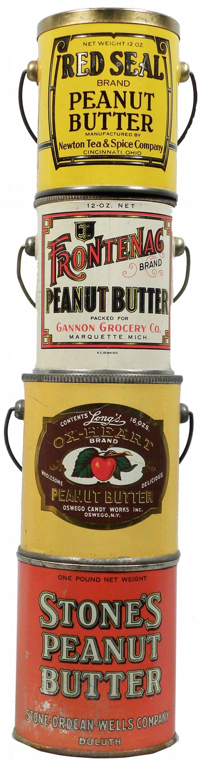 Lot of 4 Peanut Butter Pails. 12 oz Red Seal, 12 oz Frontenag, 1 lb Ox-Heart and 1 lb Stones. Stones in good condition the others near mint.