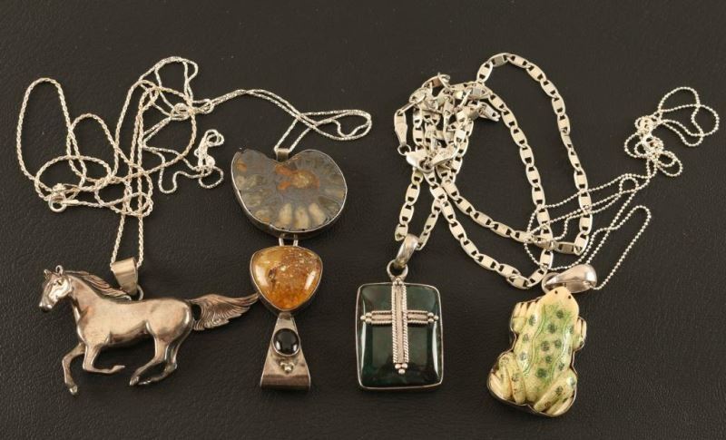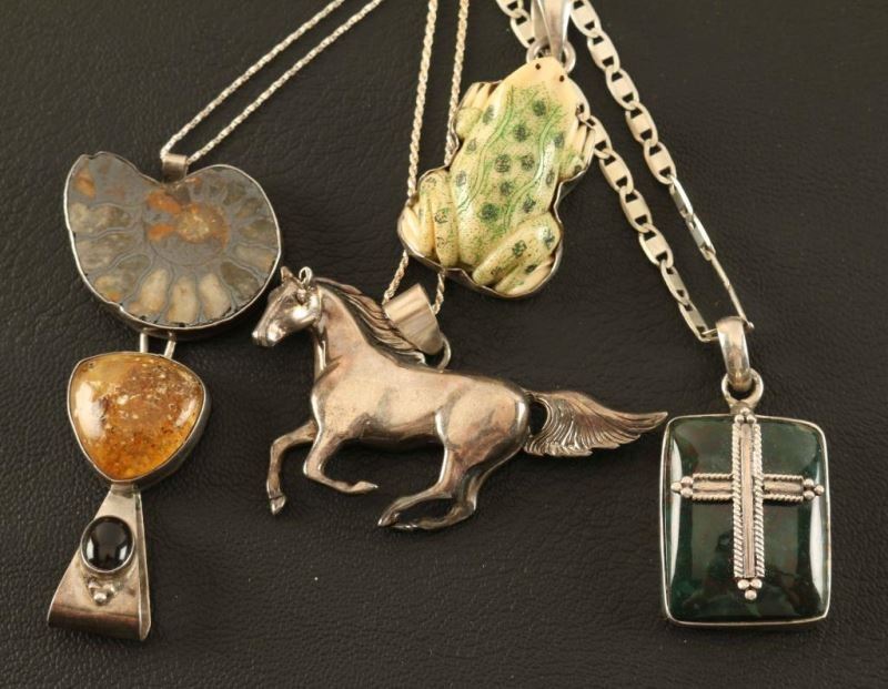 Including; square stone pendant set in sterling with silver cross on top, shell, amber and obsidian in sterling, frog set in silver and a sterling silver running horse pendant. All include silver chains.