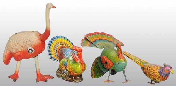 Description American and German. Working. Includes two lithographed tin turkey toys, one wind-up pheasant toy, and one wind-up ostrich toy. Condition (Very Good - Excellent). Size Largest: 8" T.