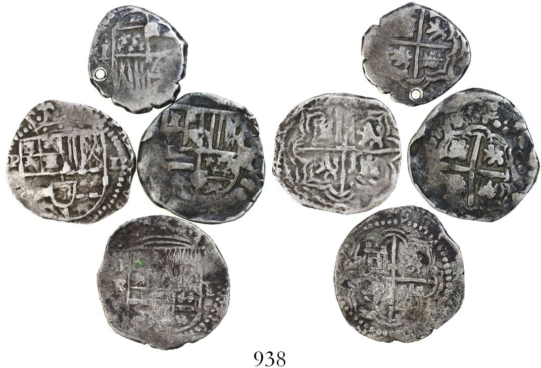 Lot of 4 Potosi, Bolivia, cob 1R, Philip II through Philip IV, assayer B and not visible. 13.08 grams total. F-VF on average, all toned, one salvaged, one holed.