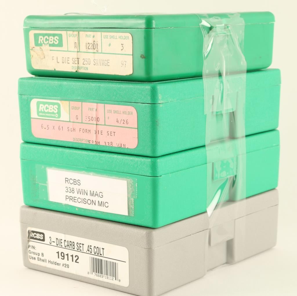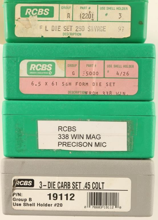 Including .250 SAVAGE die set, 6.5 x 61 S&H Form die set, .338 Win Mag die set, and a .45 Colt 3-die carb set.