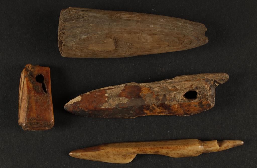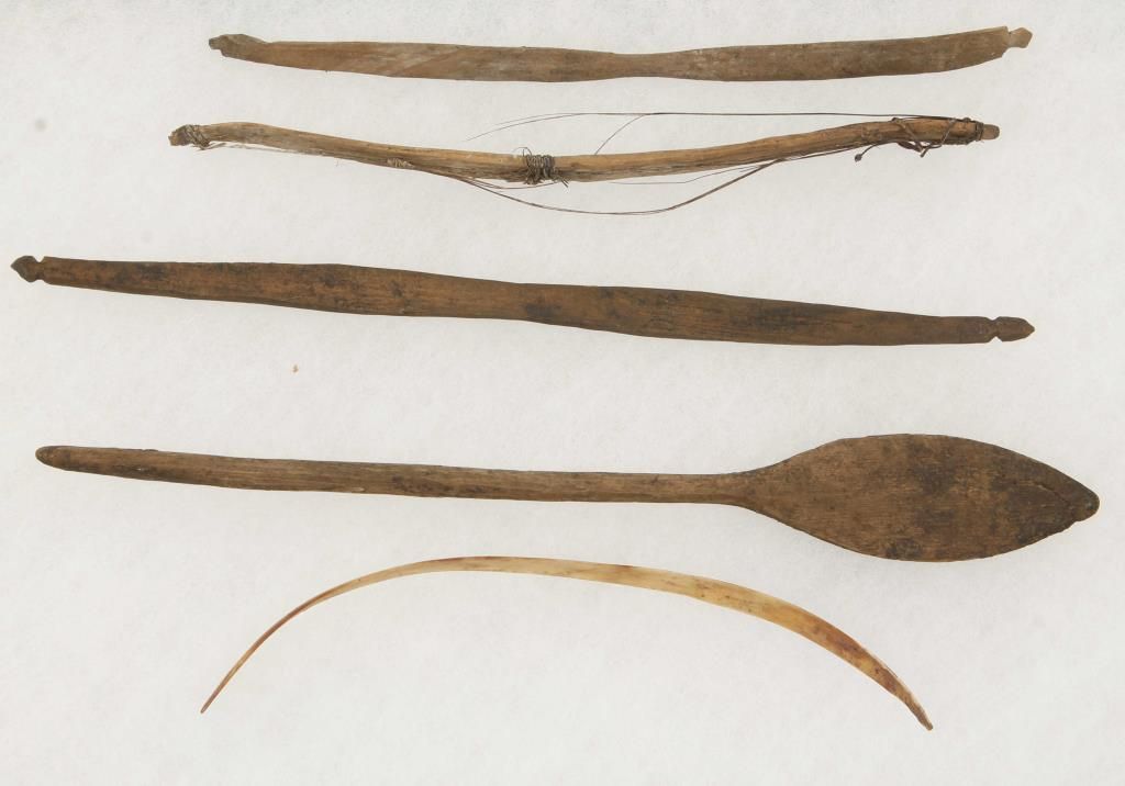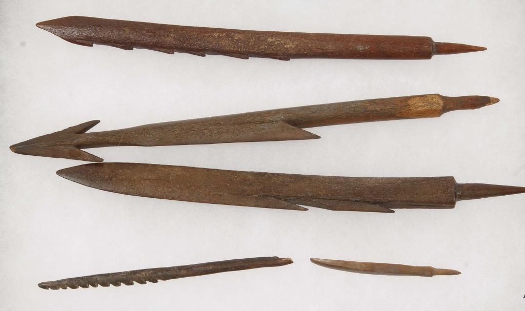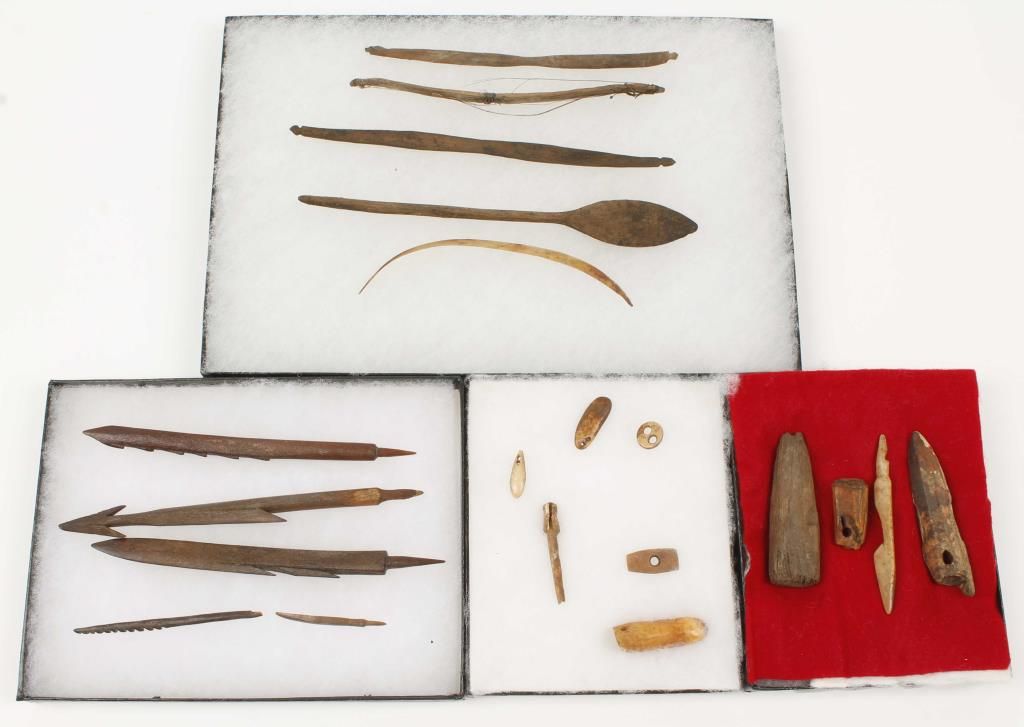 (4) Eskimo artifacts from 3/4" to 3-1/2". (6) Fossilized Ivory beads. Ranging from 1/2" to 1-3/4". (5) Eskimo artifacts including: Fossilized Walrus Ivory. Includes: Ivory spear 6-1/4" long, Ivory spear 6-1/2" long, Ivory spear-rare 6-3/4" long, Ivory arrowhead 2" long, Ivory arrowhead 3-1/2" long. All in excellent condition, all excavated in Alaska. (1) Riker mount which holds : (4) Children's Bows and (1) Paddle. All excavated in Alaska, very good condition and extremely rare.