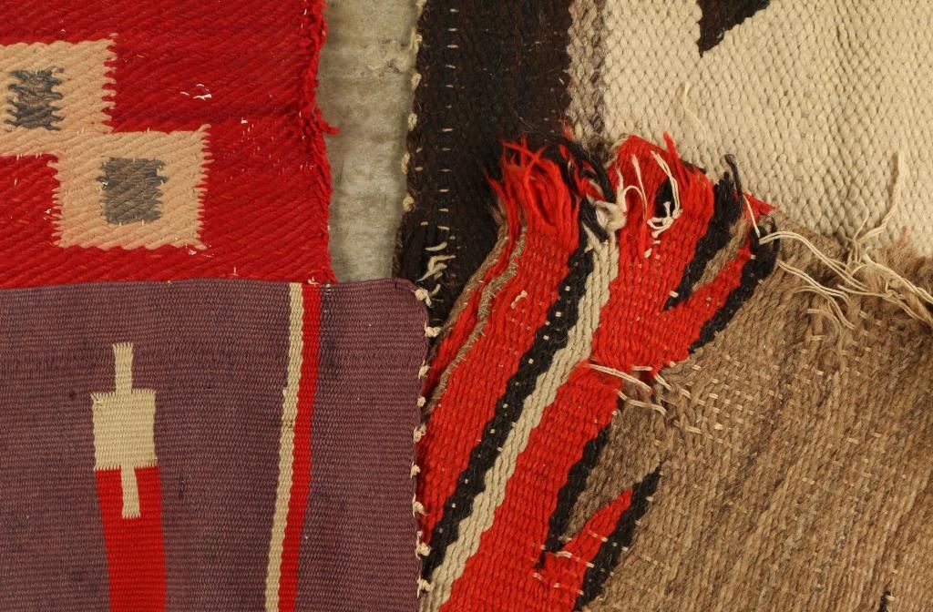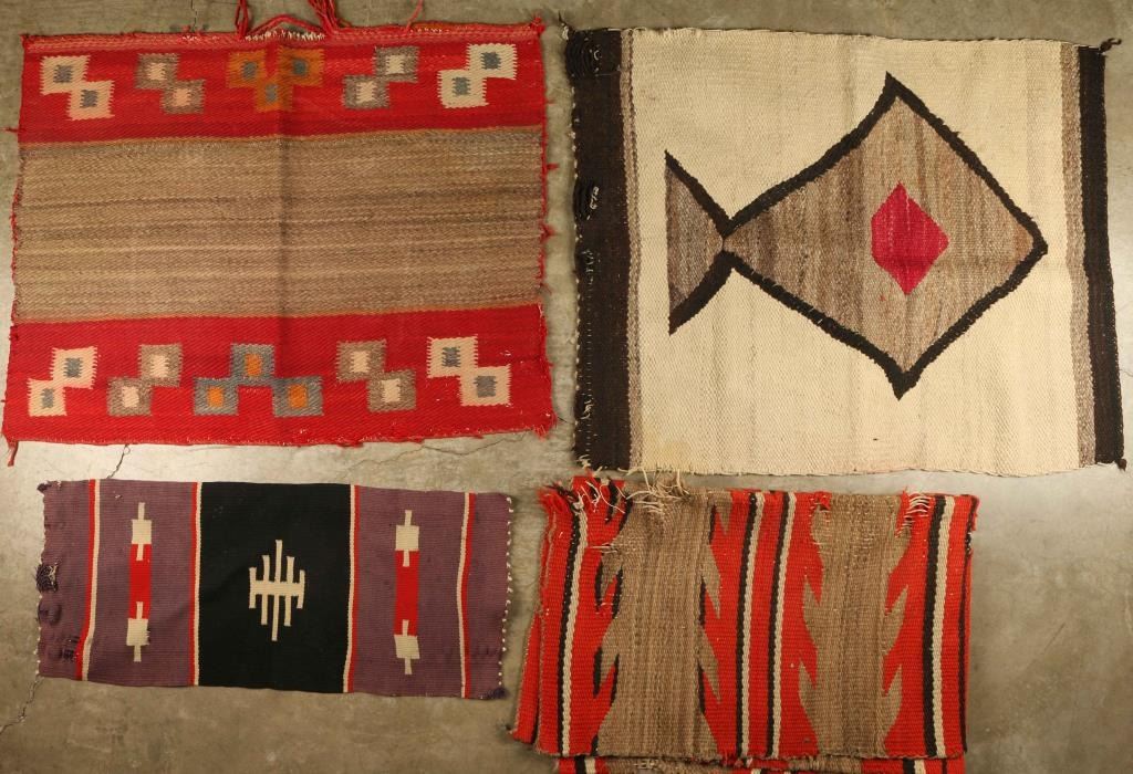 (1) Older Navajo Saddle Blanket or small rug with geometric design poor to fair losses and fraying,35x29" (1) Red and Gray Navajo Saddle Blank with squares poor condition heavy fraying 35x26" (1) Small Mexican Runner 30.5"x13 fraying and losses (1) Mexican striped rug very poor condition big tear and fraying 52"x32"