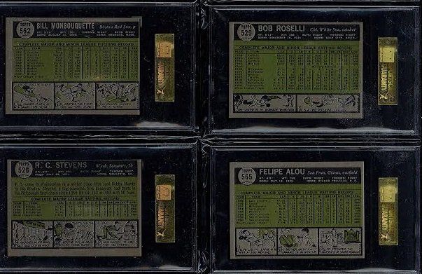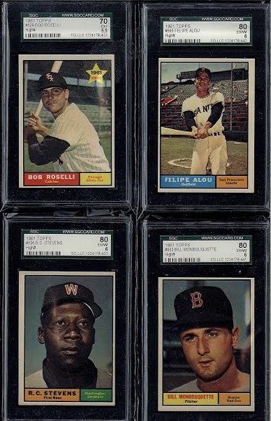 Lot of 4 SGC 1961 Topps Alou, Roselli, Stevens, Monbouquette. Lot includes #562 Bill Monbouquette SGC 6, #565 Felipe Alou SGC 6, #529 Bob Roselli SGC 5.5, #526 R.C. Stevens High# SGC 6 Card