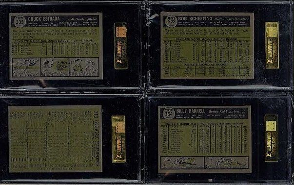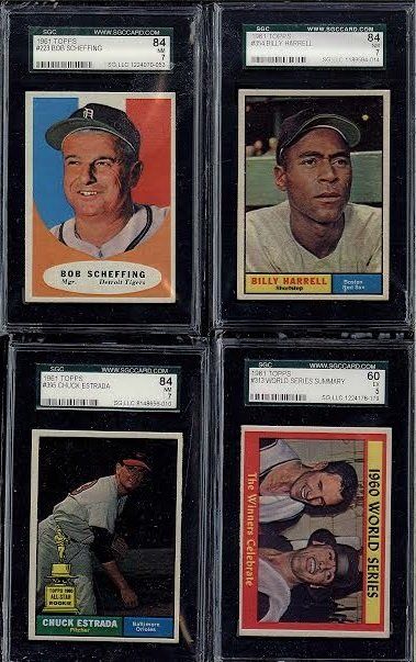 Lot of 4 SGC 1961 Topps Cards, Estrada, World Series Summary, Scheffing, Harrell. Lot includes #354 Billy Harrell SGC 7, #223 Bob Scheffing SGC 7, #313 World Series Summary SGC 5, #395 Chuck Estrada SGC 7.