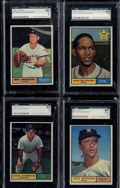 Lot of 4 SGC 1961 Topps Cards Zimmer, Burnside, Throneberry, Brown. Lot includes #391 Winston Brown SGC 7, #57 Marv Throneberry SGC 5, #507 Pete Burnside SGC 6 and #493 Don Zimmer SGC 7.