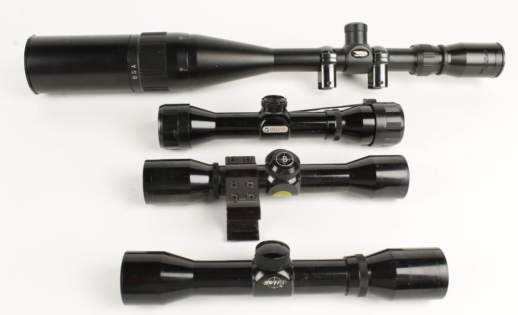 Includes Simmons 4x32, BSA Cont 6x24, Bushnell Centurion 4x, Swift Pistol Scope
