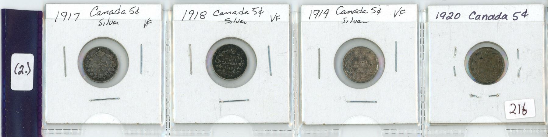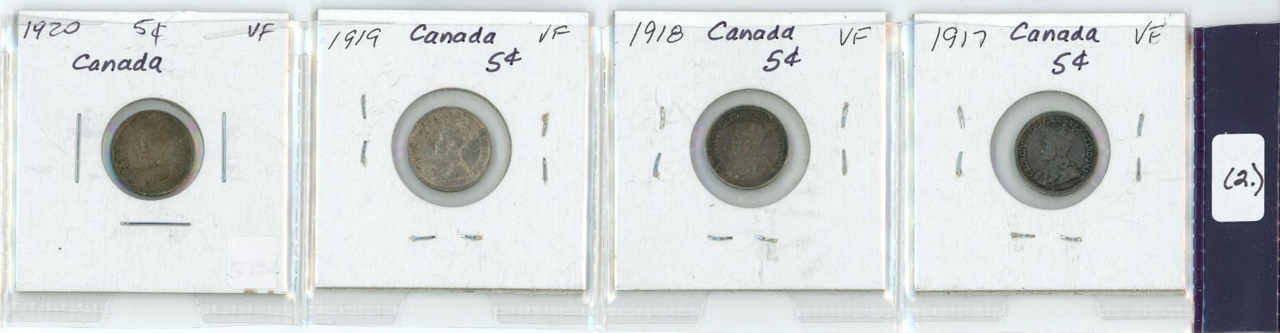 Lot of 4 Silver 1917, 1918, 1919, 1920 Canada 5¢ (2.)