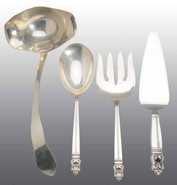 Description Silver weighs 13.1 troy ounces. Includes three International Royal Danish Pattern pieces consisting of an oval bowled serving spoon, a serving fork, and a pie server. Together with one Mexican punch ladle. Condition (Very Good). Size Ladle: 11 - 1/2" L.