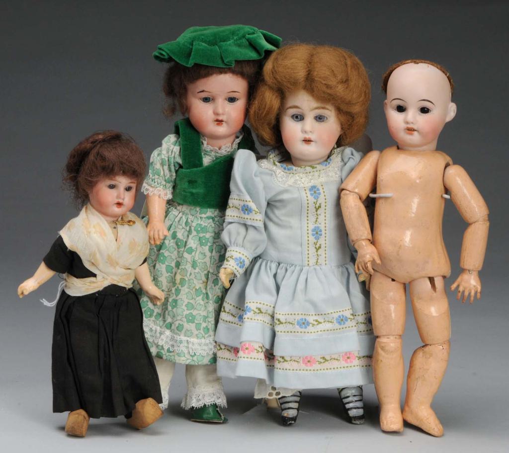 Description Largest doll marked "0" on a five-piece composition body with painted shoes and socks. Also includes a doll with open mouth on a fully-jointed French body marked "RDep", a doll dressed in a green outfit marked "E&S", and a smaller doll in an all original Dutch costume with a five-piece body. Condition (Fair - Good). Size Largest: 10 - 1/2" T.