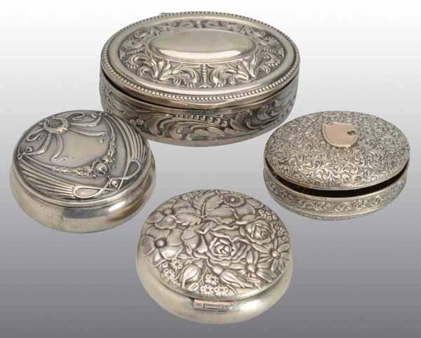 Description Weighs 2.3 troy ounces. Includes two Continental examples, one oval and one round, both with scroll chasing, one American example with the lid chased with flowers, and one oval box plated with leafage scrolls. Condition (Very Good). Size Largest: 2 - 3/4" Dia.
