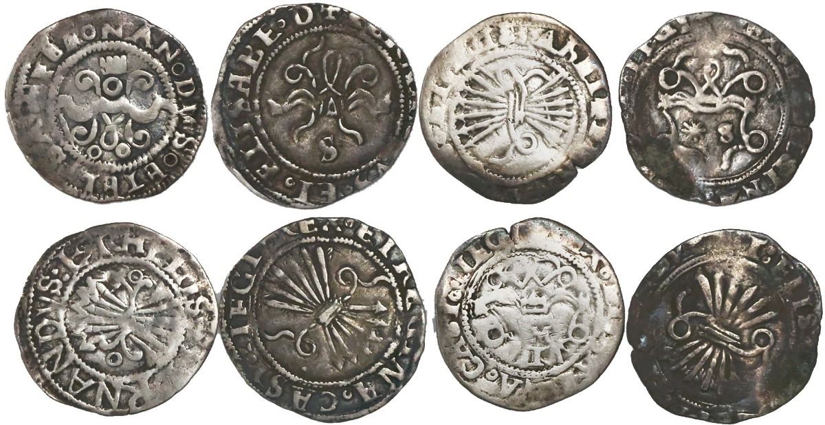 Lot of 4 Spain 1/2R of Ferdinand-Isabel, mints of Segovia, Seville and Toledo.