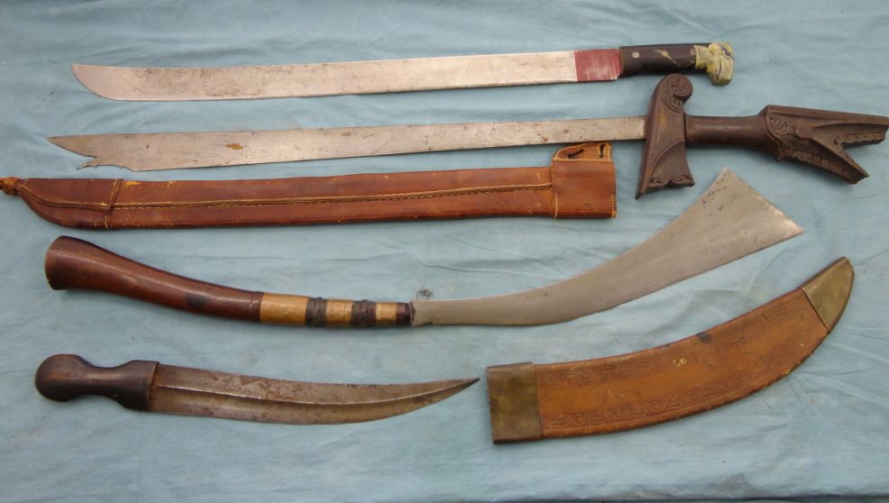 Collins style machete 31" overall w/leather scabbard. Curved Indian style knife w/wood handle. Handle loose from blade. Phillapean style sword 38" overall length w/carved wooden handle. Phillapean style ax w/heavy curved blade, wood handle approx. 33" overall length.