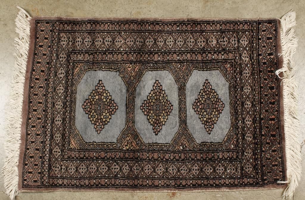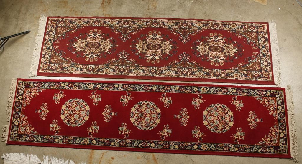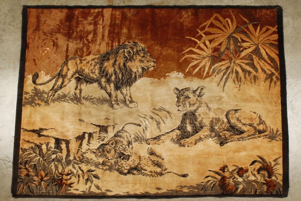 Includes (1)maroon, cream, and blues runner made of 100% worsted, wool face, moth proof, fringe ends, measures 24"x99"; (1)Oriental power woven rug that is stain, fade, & moth resistant, of 100% polypropylene fiber that measures 27"x47"; (1)grey, pink, & cream colored rug with cream fringe, measures 35"x44", and (1)tapestry showing a Lion, Lioness, and Lion cub on brown, tan, and black, measures 54 1/2"Lx39"H.