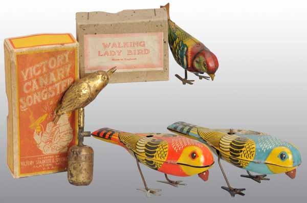 Description American and English. Working. Includes three wind-up toys. The rubber tube on the canary toy has broken apart. Two original boxes are included. Condition (Very Good). Size Largest: 5" L.