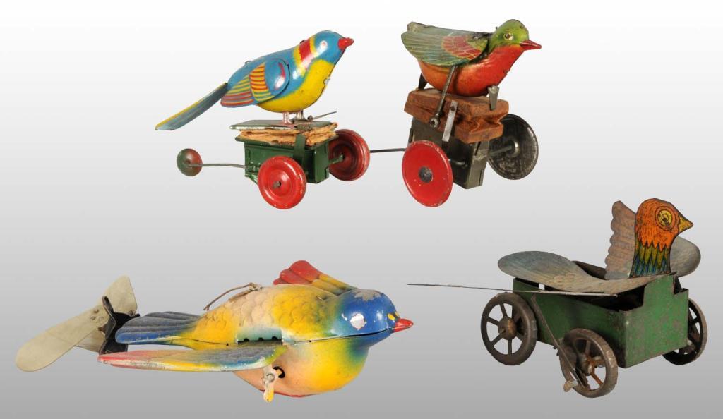 Description Pre-war and occupied Japan. Includes two early pre-war toys with flapping wings, one with bellows that squeaks when bird goes up and down. Also includes two toys marked "Made in Occupied Japan", one painted and one lithography with bellows. Largest toy includes four propellers that spin around in back and wings show movement but are not connected to mechanism. Some moderate wear overall. Condition (Very Good). Size Largest: 6" L.