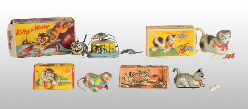 Description German. Working. Includes three marked "Made in Western Germany" and one marked "US Zone Germany". Two of the cats are chasing mice, one is chasing a butterfly, and one is rolling a ball. Includes original boxes with some creasing. Condition (Very Good - Excellent). Size Largest: 5" L.