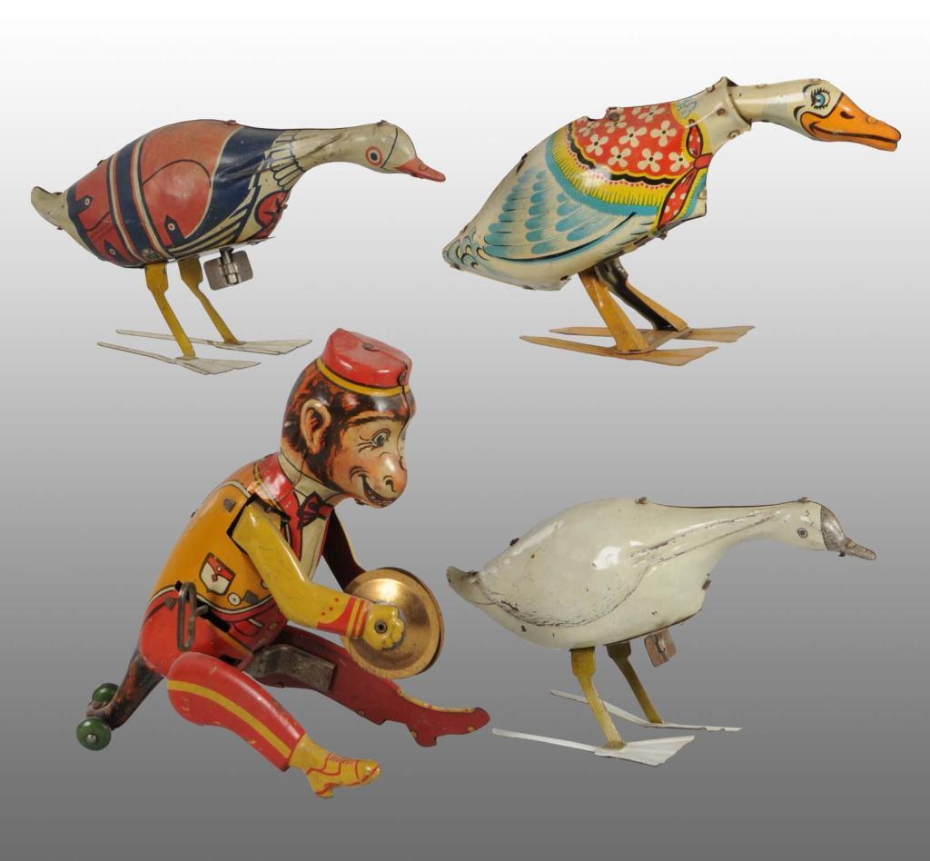Description American. Working. Includes one monkey playing cymbals and three variations of Gertie the Goose, one made for the British market. Moderate overall scratching and wear. Condition (Very Good). Size All: 10" L.