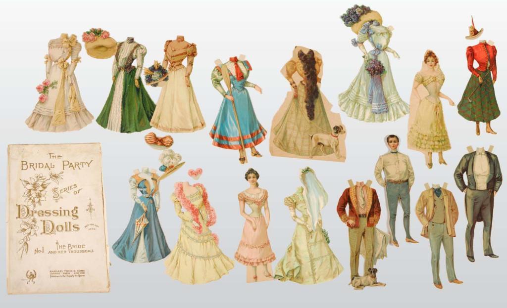 Description Circa 1890s. The Bride is complete with four outfits, four hats and a cardboard box with corner and side breaks. The boot of her golfing outfit is damaged. The Maid of Honor has four outfits and four hats with minor wear. The Bride, Maid of Honor and outfits are light cardboard with the Tuck palette/ easel mark on the reverse and in excellent condition. The Groom has three outfits; the Bridesmaid (hand missing) has two outfits and one hat. Both the Groom and the Bridesmaid are cut from a sheet, do not have the Tuck logo and are in fair/ good condition.