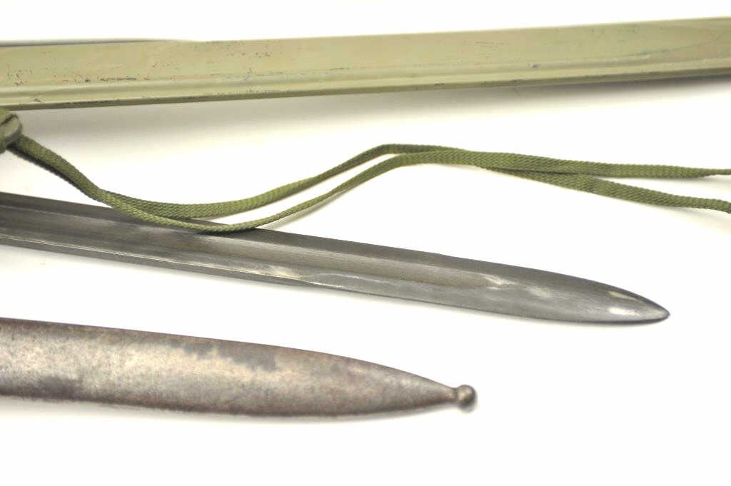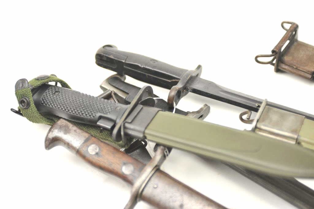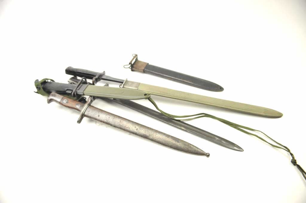 Lot of 4 U.S. Bayonets with scabbards as described: 1. ’03 rifle bayonet. U.F.H. 1942 with scabbard. Good to very good 2. Garand bayonet marked “AFH 1942. Fair togood with repainted black scabbard. 3. Krag bayonet with scabbard showing 1899 date. Good overall. 4. West German made carbine bayonet marked “748 FAD H” on the blade. Near finecondition. Post war police or military. Est.: $200-$400