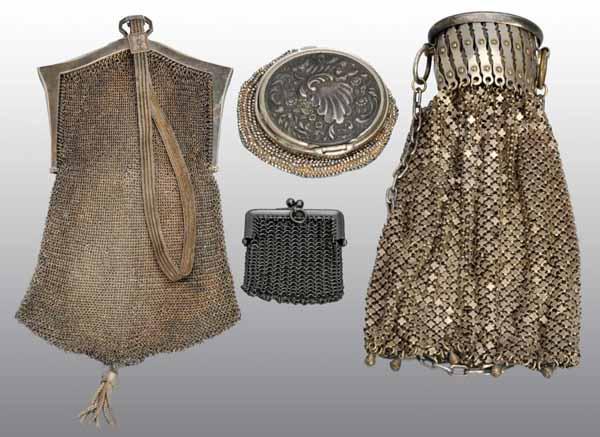 Description Includes one purse with accordion closure, one Alpaca silver mesh purse, one small doll or child purse, and one purse with hinged lid top dated 1890. Condition (Excellent). Size Largest: 7" L.