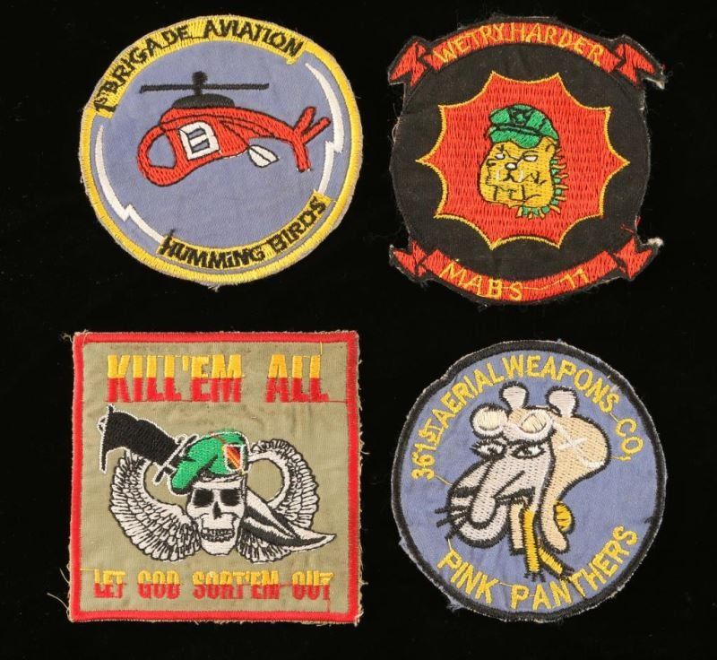 including 361st Aerial Weapons Co Pink Panthers, Kill them all let god sort it out, We try harder MABS 11, 1st Brigade Aviation Humming birds. All patches are in good condition.