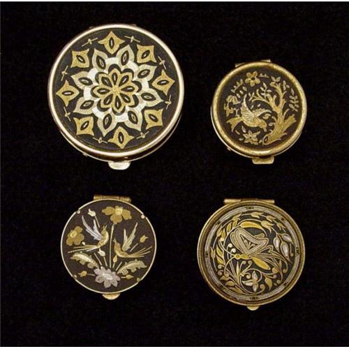 Lot of four vintage miniature pill boxes decorated with a gold tone metal design over a black background. All are unmarked but we have seen similar items marked Spain. In good used condition with minor signs of wear as shown.