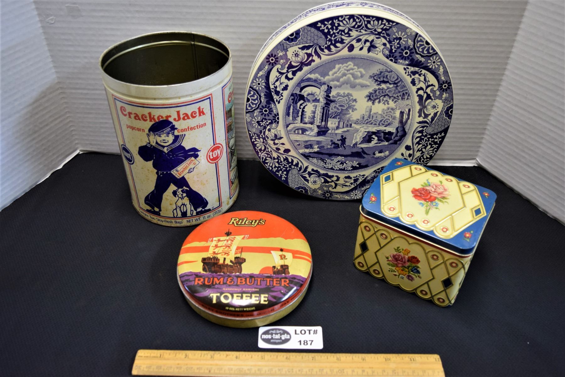 Lot of 4 Vintage Tins includes Rileys, Carr & Co, Gray & Dunn and Cracker Jack