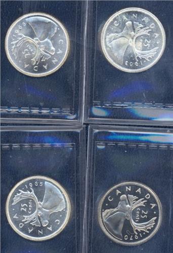 Lot of 4 X 25 Cents all ICCS certified; 1963 MS-65 Heavy Cameo, 1965 MS-65 Cameo, 1965 MS-65, 1970 PL-65 Heavy Cameo. Lot of 4 coins.