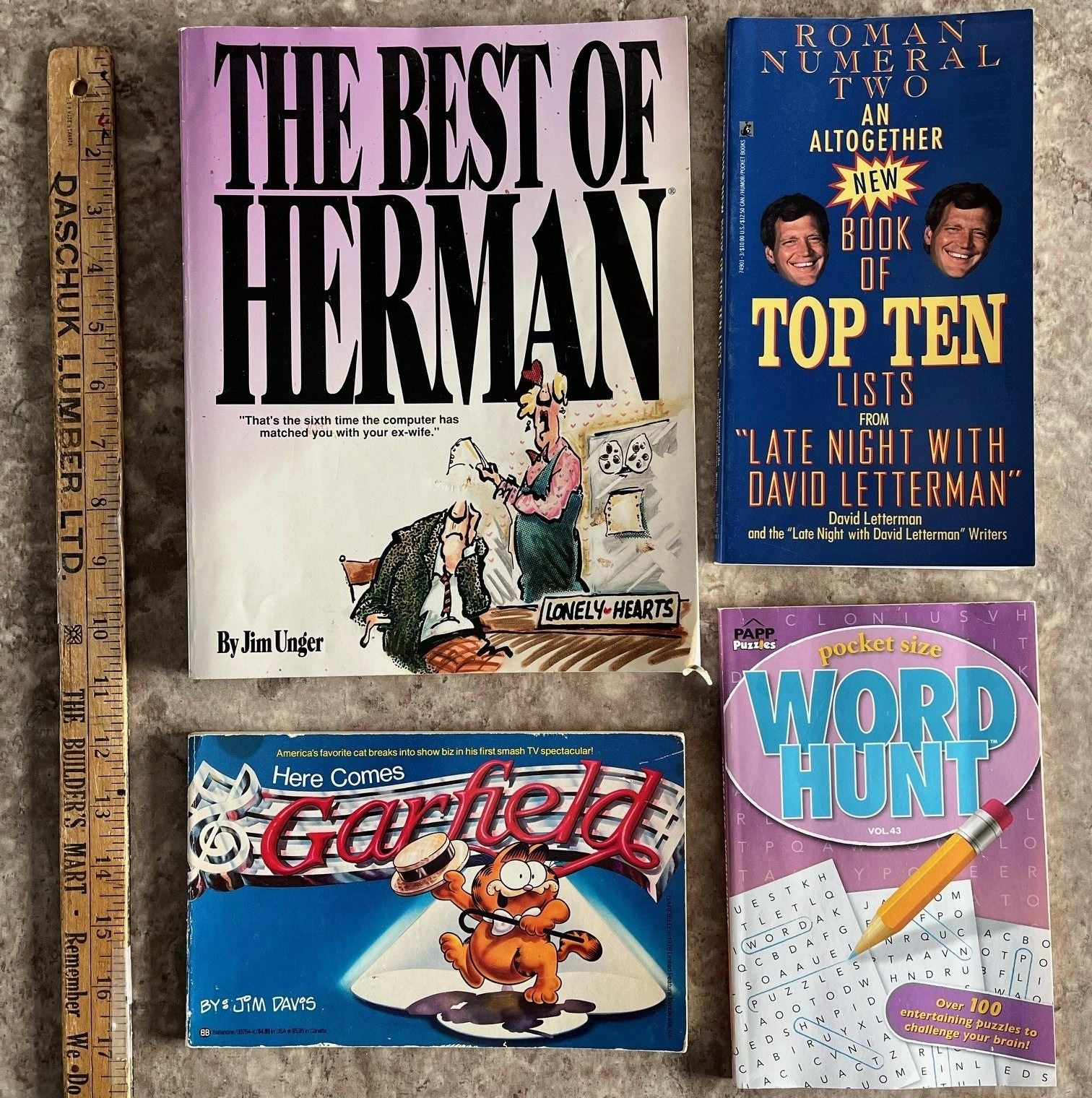 Lot of 4 books. Herman. Garfield. Letterman Top 10. Word Hunt.