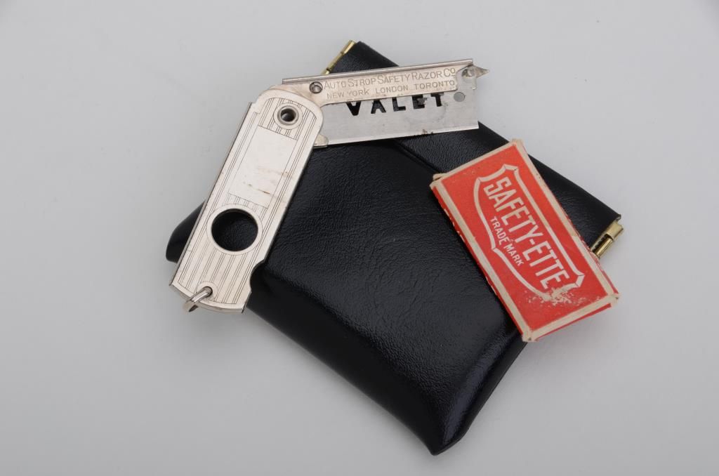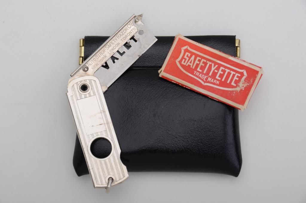 Lot of 4 cigar cutters, one with B.P.O.E. marking and one marked “Master” plus misc. double edge razor blades; all contained in a small black leather holder. Est.: $50-$100.