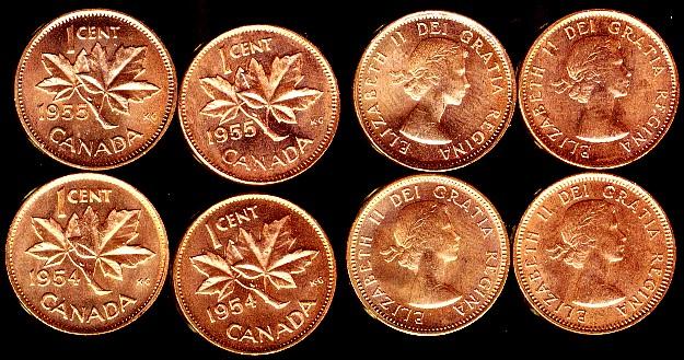 Lot of 4 coins 1¢ 1954(1) MS-64, 1955(1) MS-64,1954(1) MS-65, 1955(1) MS-65,