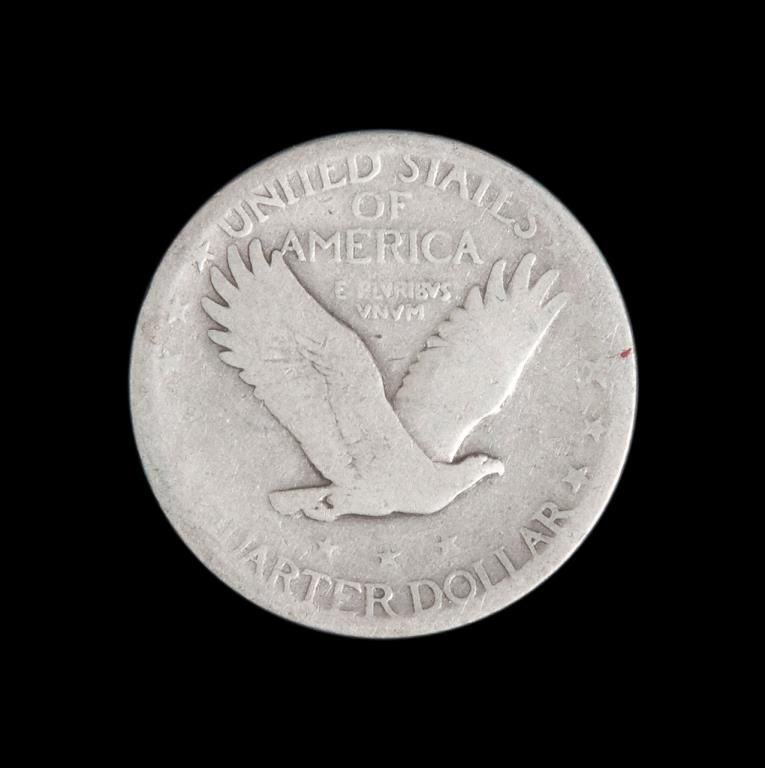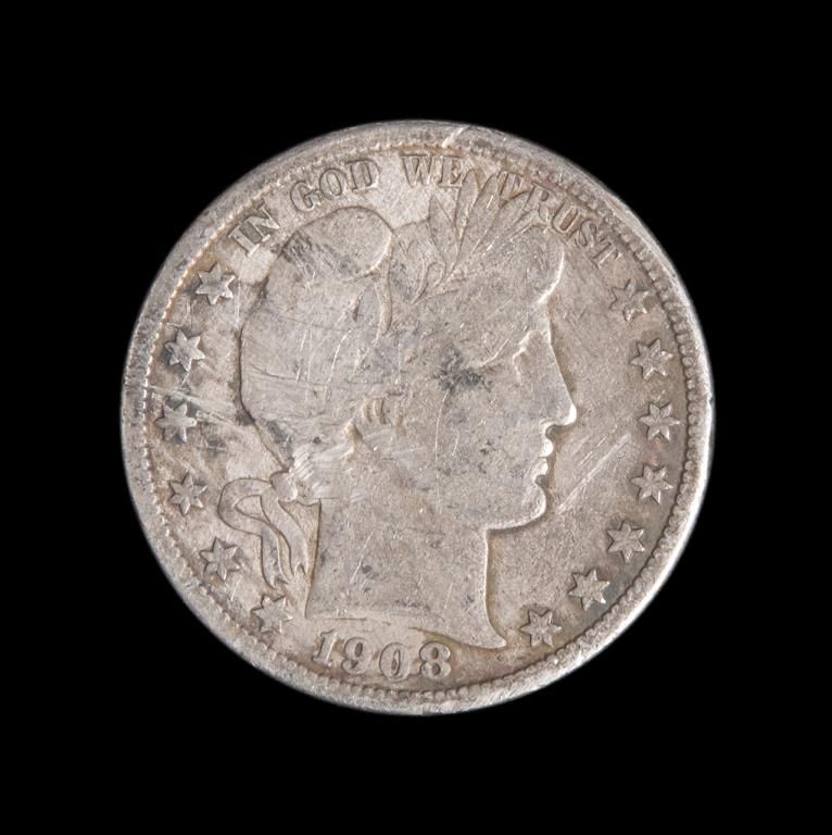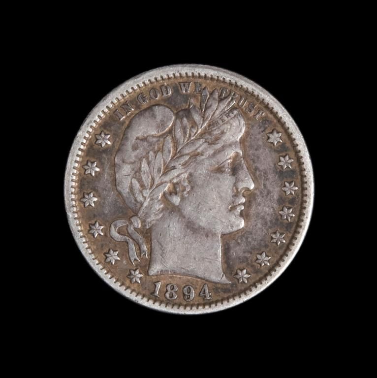 Lot of 4 coins including a 1925 Stne Mountain Commemorative Half Dollar; a 1927-D Standing Liberty Quarter (scarce date); a 1908-S Barber Half Dollar in about fine condition and a scarce date 1894-O Barber Quarter in what appears to beXF condition. Est.: $100-$190.