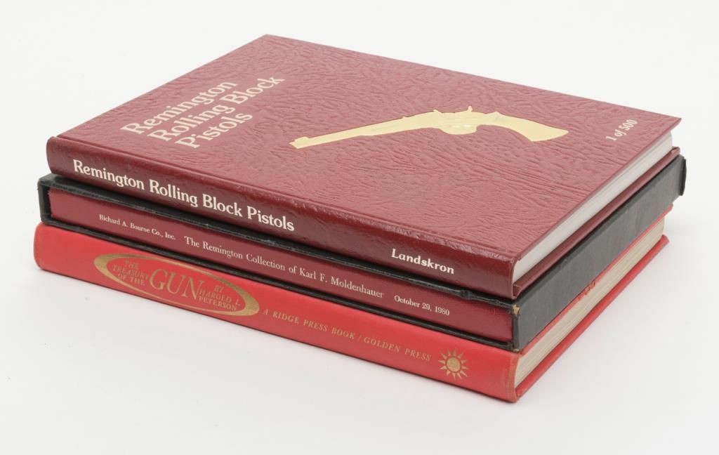 Lot of 4 collector gun reference books including the Karl Moldenhauer Collection of Remington guns (Oct. 29, 1980 at Richard K. Bourn Auction Gallery) and 3 Deluxe Editions (only 500 printed) of Remington Rolling Block Pistols, by JerryLandskrom. Est.: $175-$350.