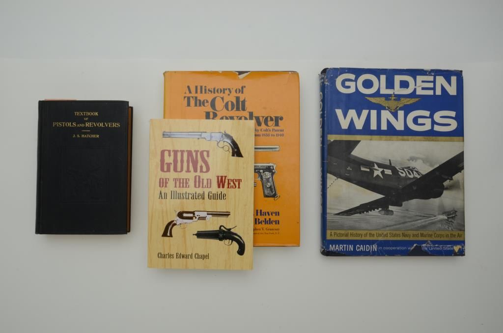 Lot of 4 collector reference books including Haven & Belden’s History of the Colt Revolver; Golden Wings by Martin Caidin; Hatcher’s Textbook of Pistols & Revolvers and Chapel’s Guns of the Old West. Est.:$50-$100.