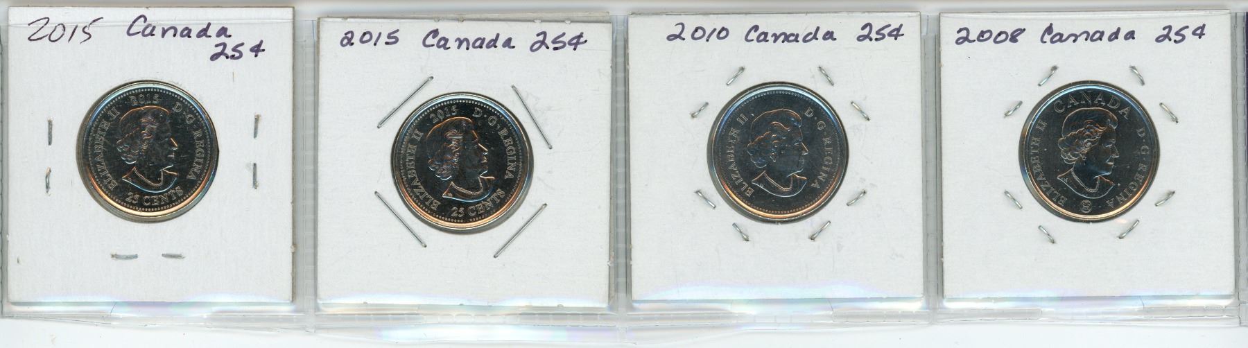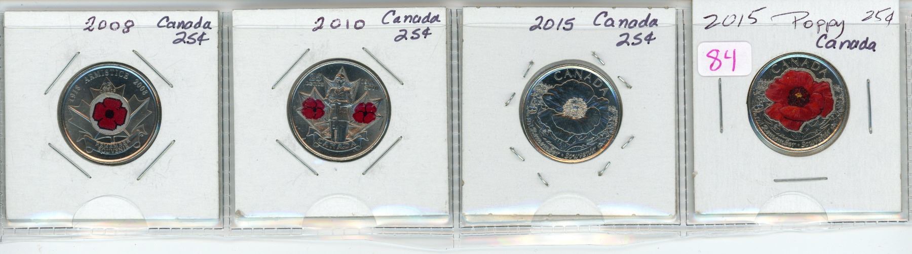 Lot of 4, coloured Canadian "poppy" 25 cent coins - 2008, 2010, 2015 x2
