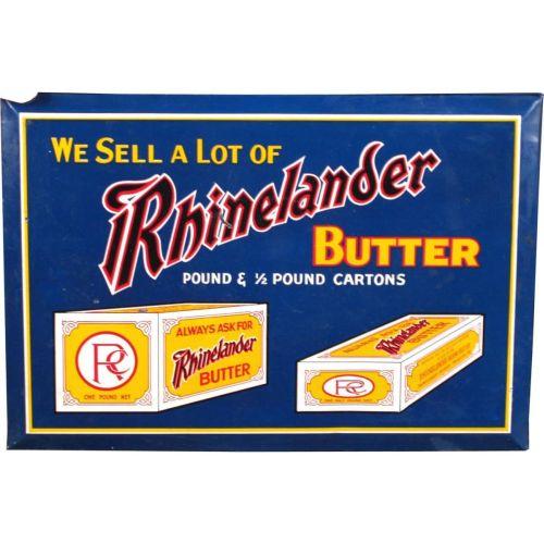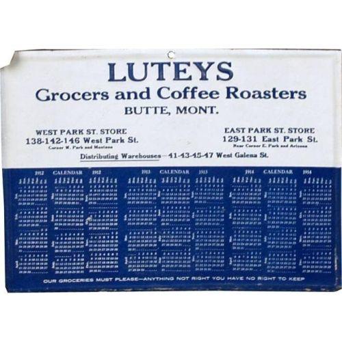 Lot of 4 country store advertising items" Small walk over tin sign in frame 8" x 12" Cinco Cigars change mat 9" x11" Lutey Grocery metal calendar from Bute, MT 1912-1914 - 5" x 7" and and easel backed Rhinelander butter sign 9 ¼" x 13 ¼"