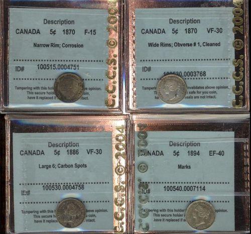 Lot of 4 four Five cents, all CCCS graded with comments, 1870 Nar 0 F15 corrosion, 1870 Wd 0 VF30 Cleaned, 1886 Lg 6 Carbon spots & 1894 EF40 Marks.