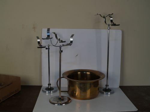 Lot of 4 items: 3 Shoe display racks & a Brass Railroad Chamber Pot (recreation)